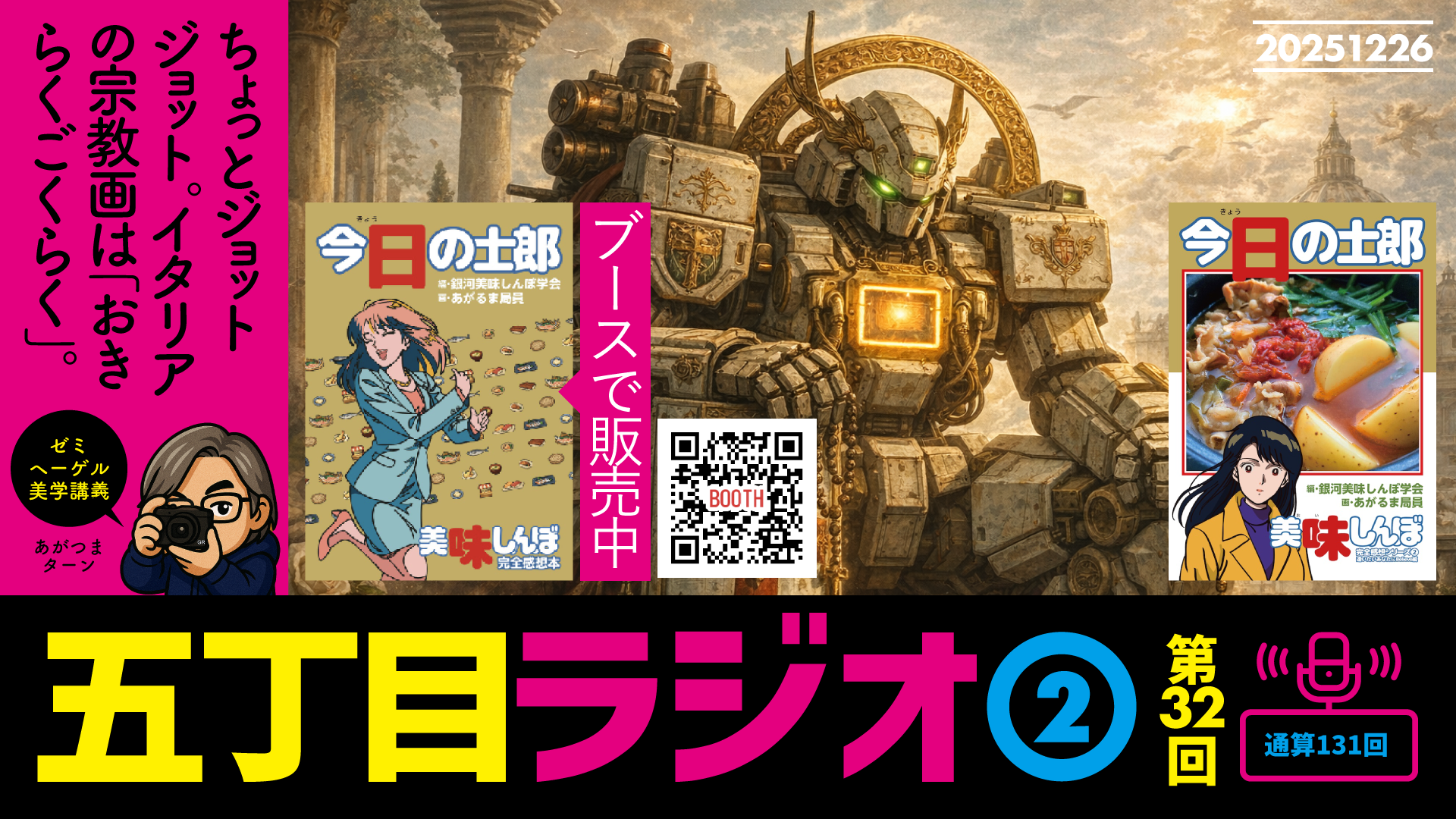 五丁目ラジオ2木曜日:「ちょっとジョットジョット」イタリアの宗教画の本質は「おきらくごくらく」であるSP 更新日:2026年1月5日 公開日:2025年12月26日 podcast 『五丁目ラジオ 第131回』は、新井さんが、今年から個人的な米作りを始めたというお話からスタート。実家の田んぼで、宇都宮大学が開発した特殊な米を育てている。そして、目指すのは、通販ではなくイベントでの対面販売。「生産者か […] 続きを読む